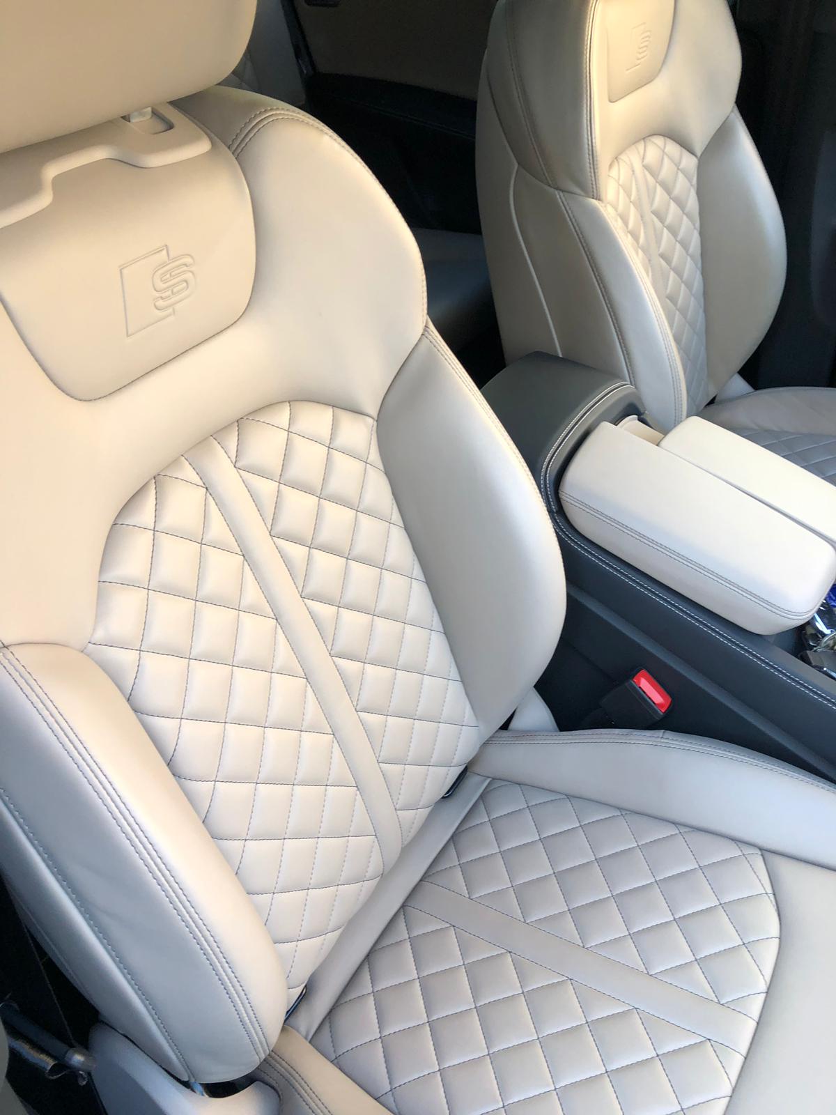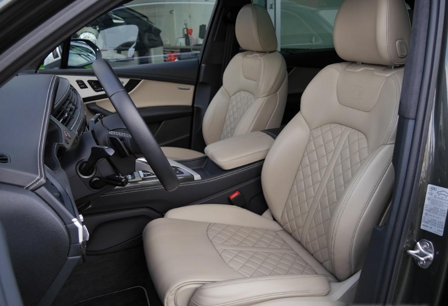 N0Q Poťahy sedadiel v koži Valcona s kontrastným kosoštvorcovým štepovaním a S emblémom; vsadenia vo dverách v poťahu Alcantara