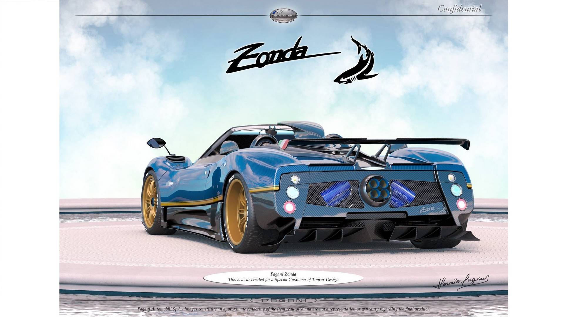 S logom TopCar dostane nové Pagani Zonda aj telo z exponovaných uhlíkových vlákien v modrej farbe a dizajn doplnený o taliansku trikolóru a originál disky v zlatej farbe. Takmer všetko čo je vidieť je vyrobené z uhlíkových vlákien. Interiér je kombináciou retro štýlu s drevom a športovej elegancie.